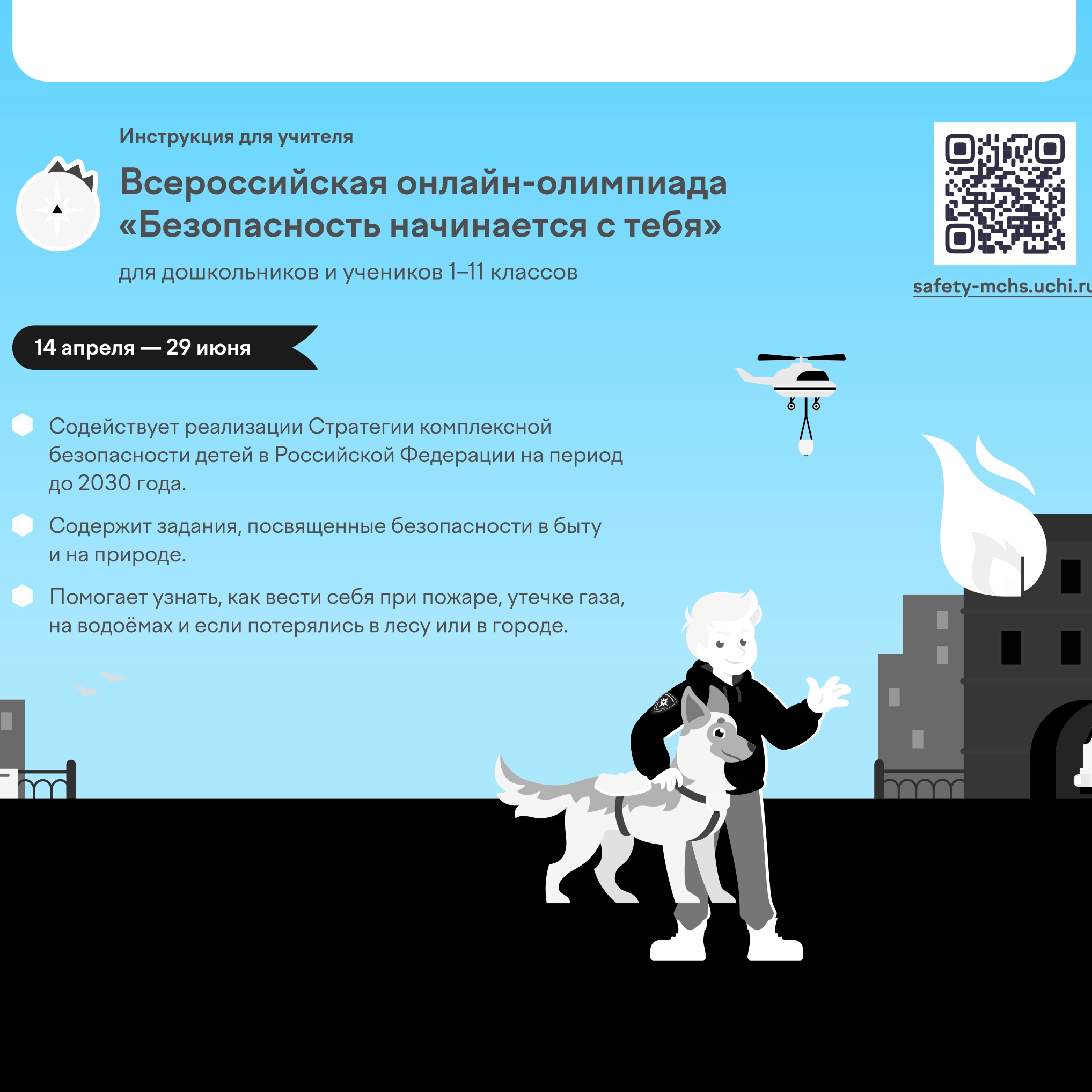 В рамках национального проекта «Инфраструктура для жизни» Минтранс России, ГУОБДД МВД России и АНО «Национальные приоритеты» при поддержке Министерства Просвещения проводят всероссийскую онлайн-олимпиаду для школьников 1-11 классов «Безопасность начинается с тебя» (далее – Олимпиада)